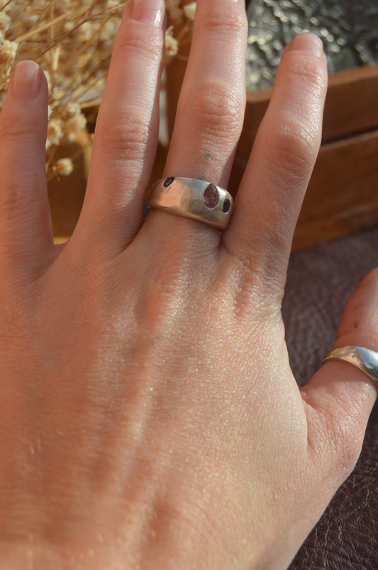 Dome ring with blue sapphires and rough cut garnet size 6